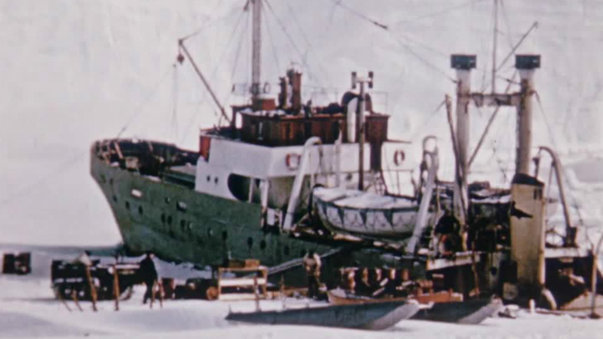 The expedition’s ship – the 600-ton ‘Norsel’ - sailed from Cape Town on 28th December 1949; heavier equipment and supplies sailed from Oslo, Norway, on the 24,000-ton whaler ‘Thorshøvdi’, together with 60 dogs (not all of whom survived the journey). Two light ‘Auster’ aircraft were taken for reconnaissance. Charles Swithinbank, an assistant glaciologist and Alan Reece, an assistant geologist were the British scientists. The film shows the transfer of supplies, the Norsel navigating the pack-ice, the establishment of Base Camp and the transportation by ‘Weasel’ (amphibious tracked vehicles) of 450 tons of supplies in preparation for the two year expedition.