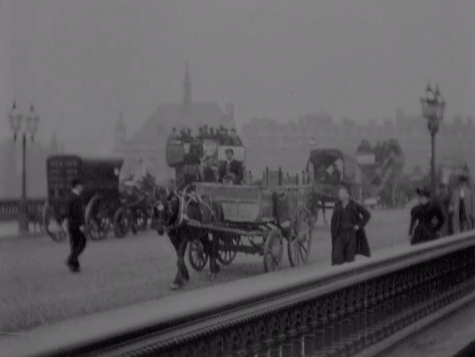 This 'actuality' film of Blackfriars Bridge in London was taken by pioneer Victorian R.W. Paul in July 1896, with his camera positioned at the southern end looking northwards over the Thames. It was screened as part of his Alhambra Theatre programme shortly afterwards - certainly no later than 31 August, as it's included in a printed programme of that date (as Traffic on Blackfriars Bridge). Two or three of the pedestrians seem aware of the camera's presence.