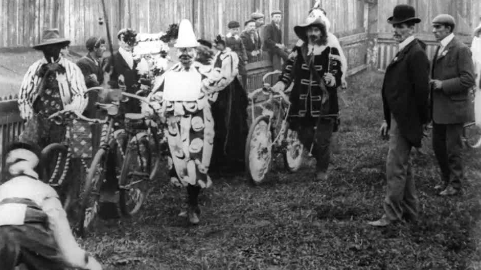 In the early days of cycling, it was common for cycling clubs to join in with local parades. Occasionally, prizes were given out for a variety of achievements, including individual and group costumes. In the early days of filmmaking, such a light-hearted parade made a wonderful subject for a film: not only was it guaranteed to be varied and interesting, but a good showman could persuade everyone he filmed to attend the screening and spot themselves. In this film, a motley parade of would-be punters files past the camera in a variety of costumes, notably a representation of the yacht Shamrock, built for Lipton’s tea magnate Thomas Lipton.