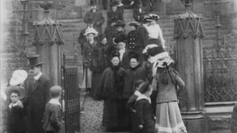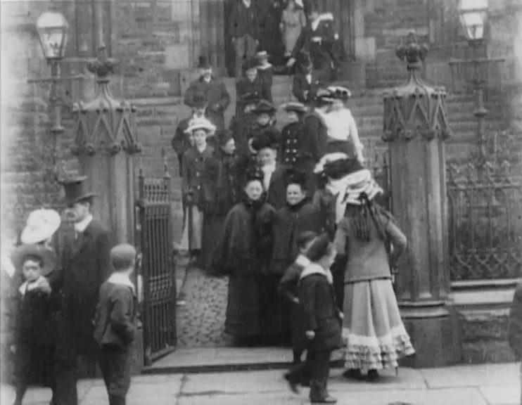 By including the church steps in the framing, this film becomes an Edwardian fashion parade as members of the congregation, clad in Sunday best, walk from the top to the bottom of the screen before taking a side exit. As with Mitchell and Kenyon's similar 'factory gate' films, the mischievous small boys hanging around outside seem more aware of the camera's presence than do most of the adults.
