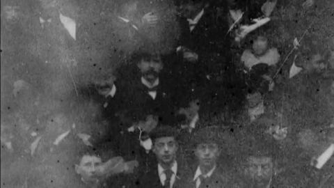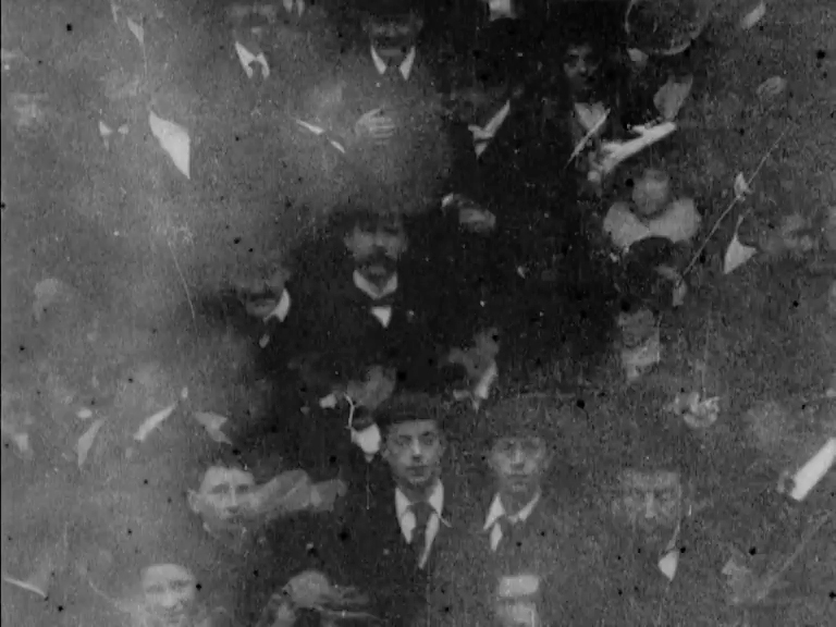The very tight shot means we don't get to see much of the magnificent St Mary's cathedral, but we get so close to the densely-packed congregation that we can almost read their thoughts. The prospect of being filmed seems to cause considerable excitement and curiosity among the dignified churchgoers - from every layer of Dublin society - who glance at the camera or stand transfixed before it.