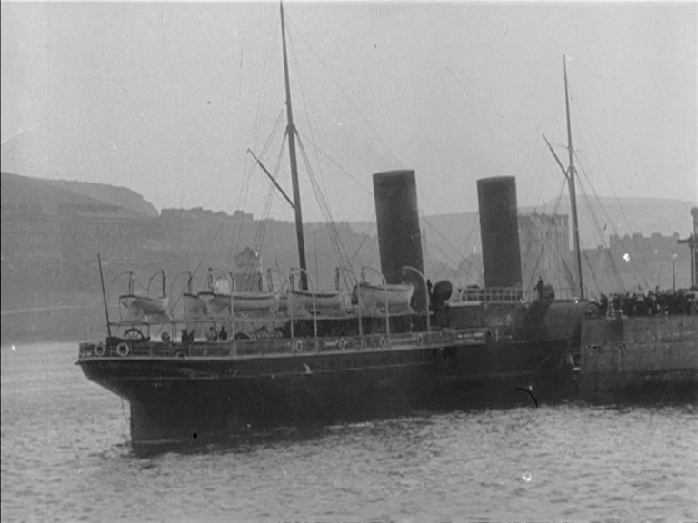 The movement of the boat, the angle of the camera towards the jetty, and the extraordinary depth of field on this shot all add up to a spectacular view of arrival at the port of Douglas, with an almost stereoscopic, 3D effect. It was most likely filmed on the occasion of King Edward VII and Queen Alexandra's visit to the Isle of Man, which features in two other Mitchell and Kenyon films.