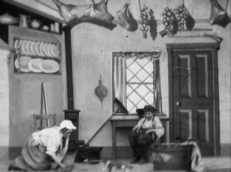 Naughty boys and girls were a popular staple of early film comedy. This mischievous little tyke certainly has a good eye for an opportunity, revenging himself on his tyrannical grandmother by cunningly applying a pair of bellows just as she has her face buried in a sooty stovepipe. It's a variation on the classic foot-on-the-hosepipe gag, as immortalised on film in the Lumiere Brothers L'Arroseur arrosé (France, 1895), remade in Britain by Bamforth as The Biter Bit (1900).