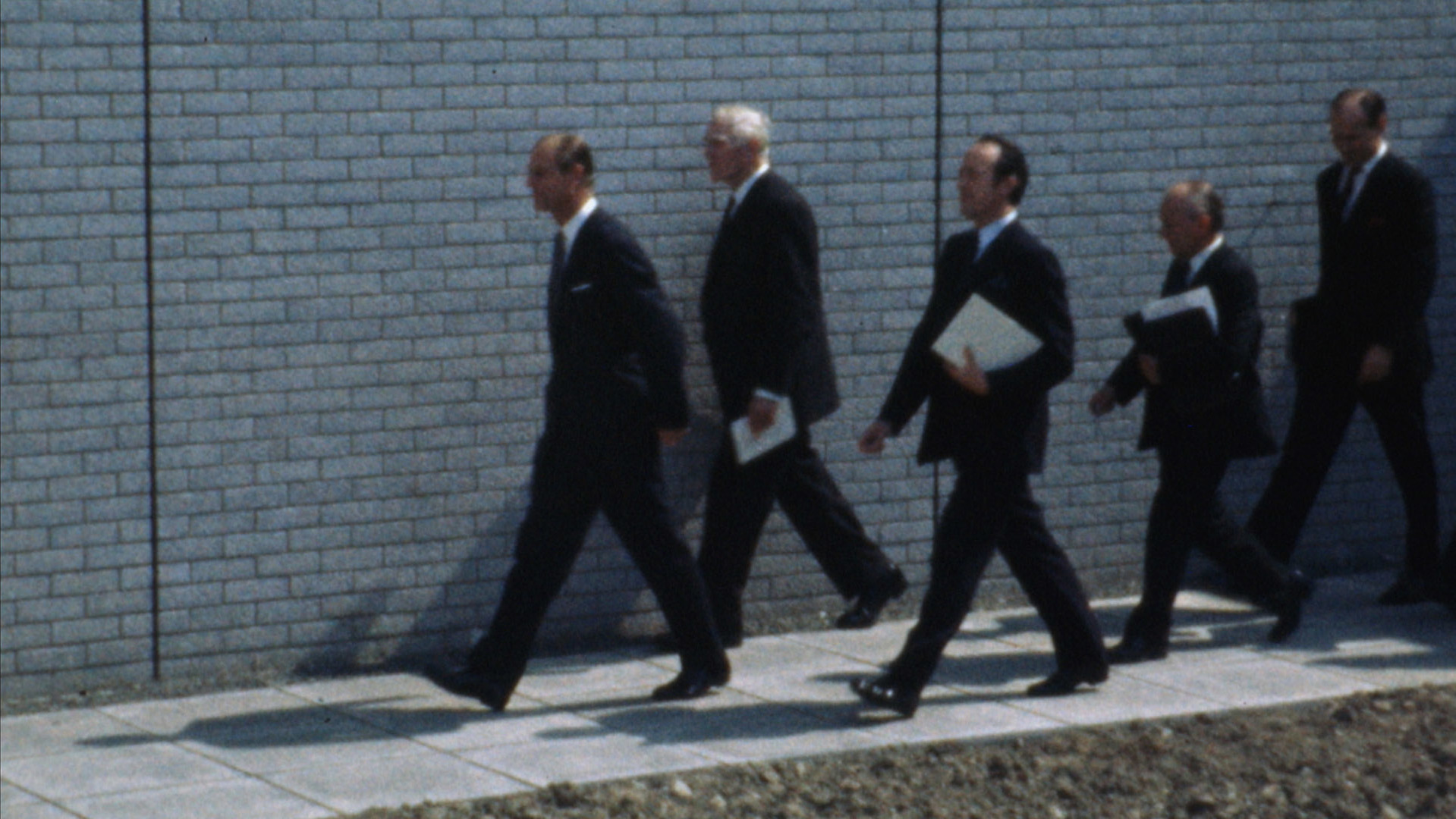 A crowd of well-wishers greet Prince Philip, Duke of Edinburgh, outside the University of Wales' Old College on the promenade. The building is bathed in sunlight for his visit which takes place before the graduation ceremony in the Great Hall of the Arts Centre (completed only 3 years earlier). The Duke is present as Chancellor of the University of Wales.