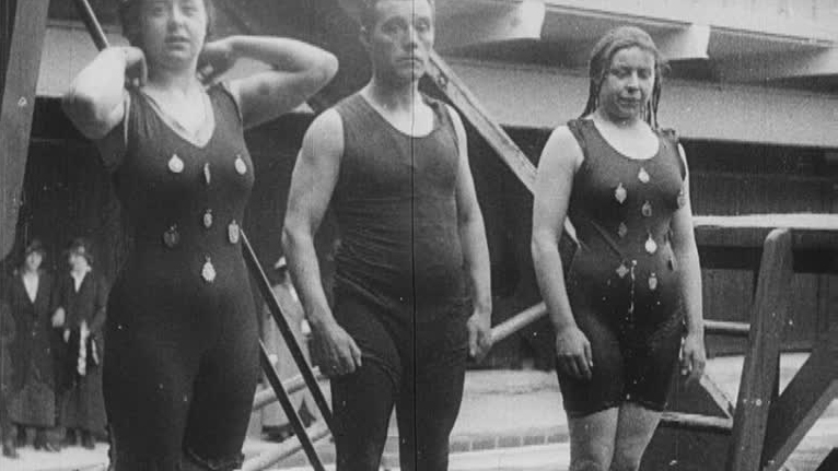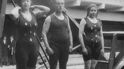 Come on in, the water's lovely! Southend's open-air pool first opened its gates in May 1915, but the warm coats and hats on show here suggest that spring hadn't quite sprung yet. Most visitors seem happy to keep their clothes on, but a trio of hardy divers take to the boards for Topical Budget's cameraman.