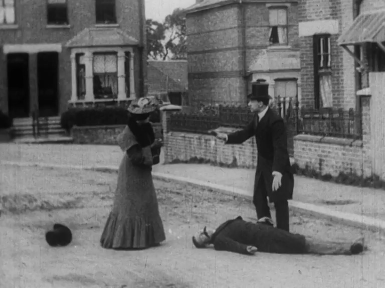 This elaboration of the early film 'motor accident' mini-genre was filmed in the streets near RW Paul’s Muswell Hill studio. It’s reminiscent of earlier films such as Hepworth’s How to Stop a Motor Car (1902) or his even earlier Explosion of a Motor Car (1900), in which people run over by vehicles are replaced by dummies for comic effect. Paul's film, though, has more characters and a more fully realised storyline. Paul would go on to make an even more elaborate and imaginative multi-scene film, The ? Motorist, in 1906.