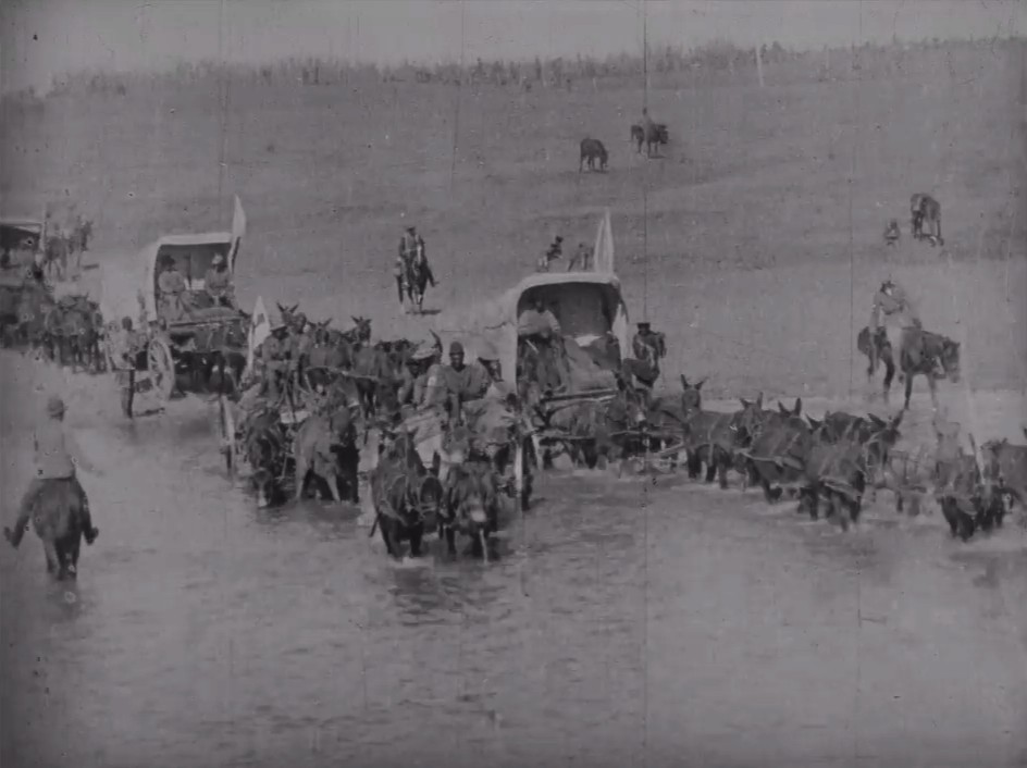 This is a fragment of a longer film showing field ambulances crossing the Vaal River, which served as the boundary between the Orange Free State and the Transvaal in South Africa. It is evidently a difficult river to cross, shown here and in other films Joe Rosenthal made for the Warwick Trading Company in late May 1900. As the campaign advanced some 60,000 of Lord Roberts’ troops had to make it across the Vaal.