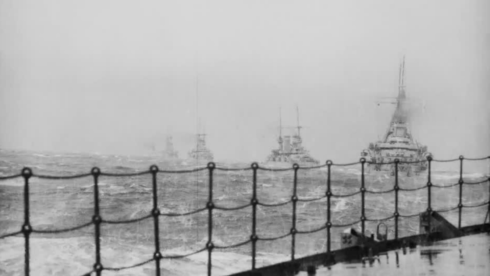 A row of warships, (six are visible) have formed line and are at full steam. The scene is filmed from the stern of one of the ships. It's possible this film it was shot by the British Biograph Company during the Diamond Jubilee Review of the Fleet at Spithead on 26th June 1897. The company certainly filmed at this event.