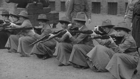 "Three cheers to our gallant soldiers", proclaim suffragette marchers as they rally to show their willingness to help the war effort.