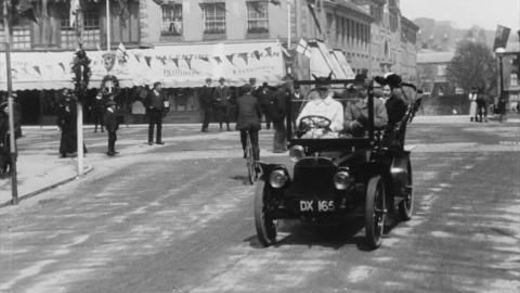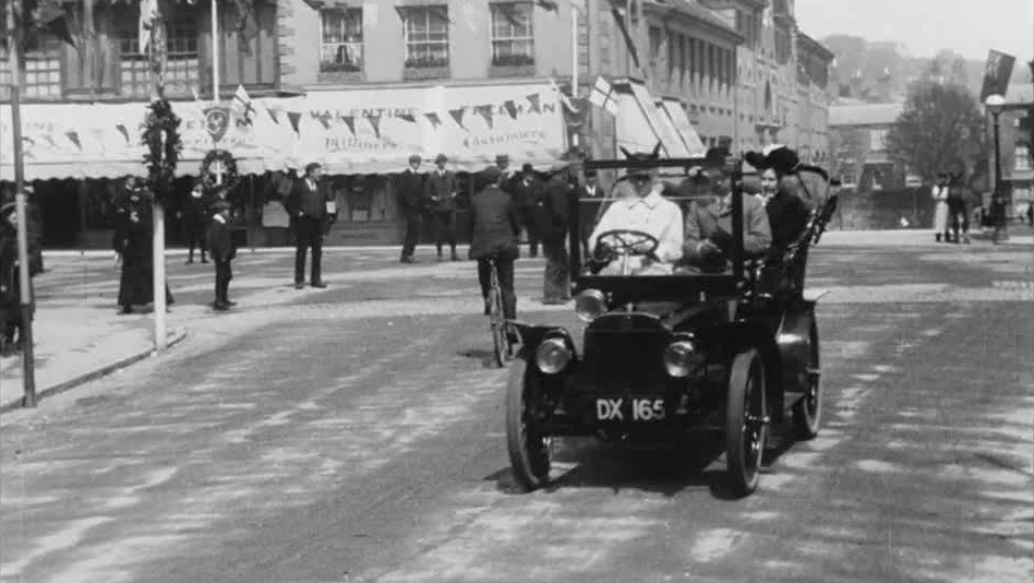 Enjoy a day in the life of Stratford-upon-Avon's Edwardian residents, including some of the town's top brass, in this fascinating early travelogue by Birmingham film showman Waller Jeffs. After some shiny new motor cars pick up the mayor and councillors from the town hall, we follow the perennial tourist route on to Anne Hathaway's cottage and a traditional maypole dance.