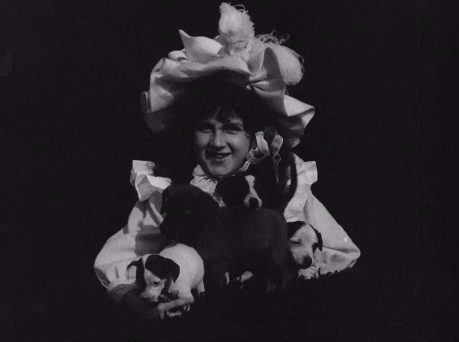 Early movies were all about the pleasures of spectacle and movement, so what could be a better use of a few feet of film than these adorable puppies? The young lady in the bonnet and bows valiantly tries to hold all the doggies in a loving squeeze, but they're excitable creatures, which seems to amuse her as much as it does us. Cute puppies are a perennial joy but this film in particular evokes the classic Pears Soap advertising of the early 20th century.