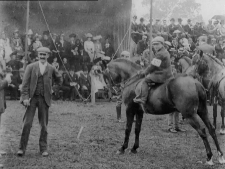 Cyclists valiantly pedal round a grass track and horses are taken through their paces at what was clearly a lively day in front of a large Leeds crowd. The cameraman is better placed for the horses than for the cycling - which is partly obscured by a group of officiators. One young rider, carrying his rosette in his mouth, keeps his mount still for just long enough to tip his hat for the camera.