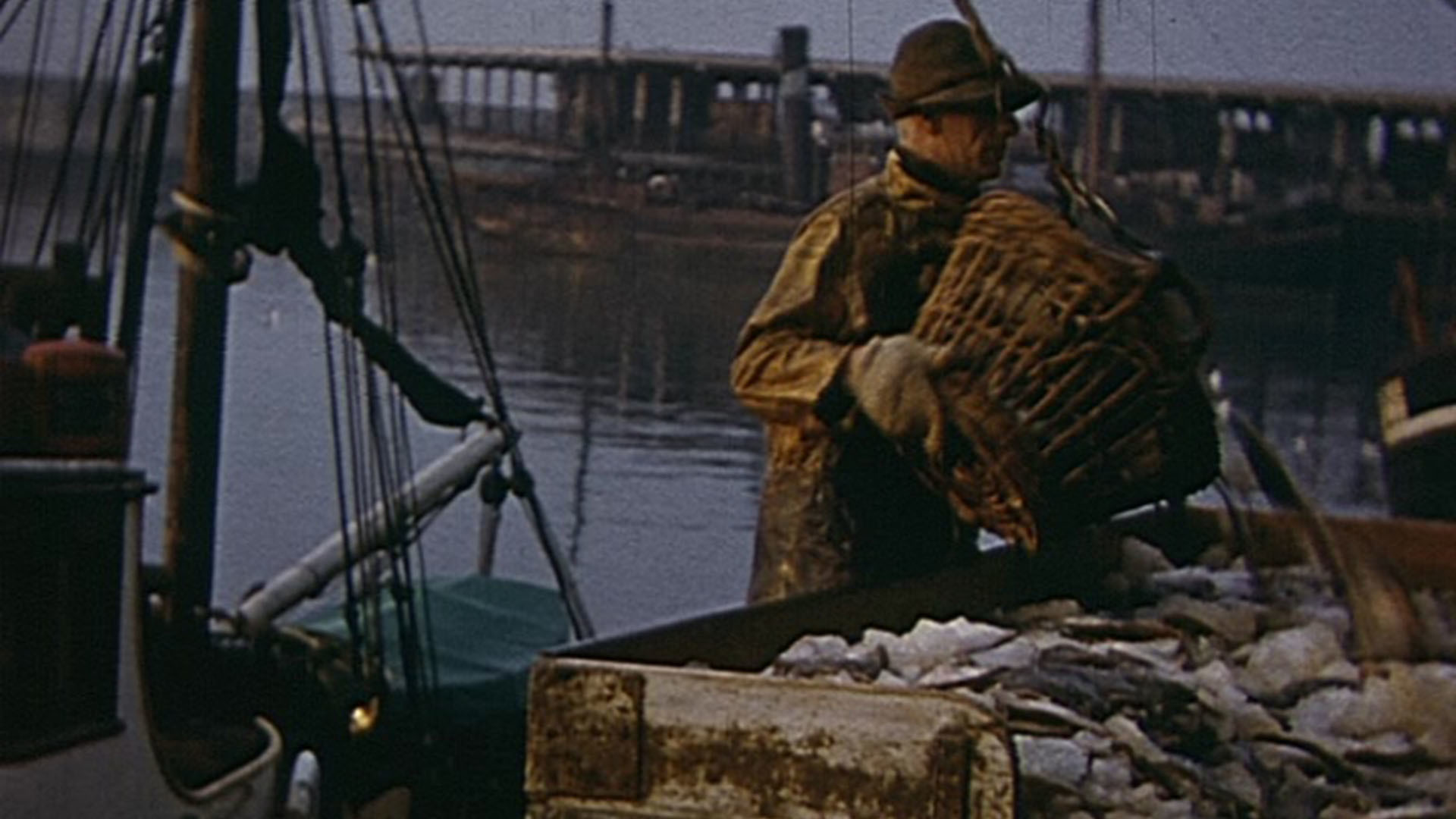In 1955, Frank Barnitt, a member of the Institute of Amateur Cinematographers, took along his 16mm camera and a roll of colour film, to the harbour at Lowestoft to record the flurry of activity as the fishermen work quickly, unloading the trawlers and sorting their catch. At this time, Lowestoft’s fishing industry was thriving. Seagulls hang about, as the fish are expertly gutted and filleted, and fishermen mend nets ready for another day.