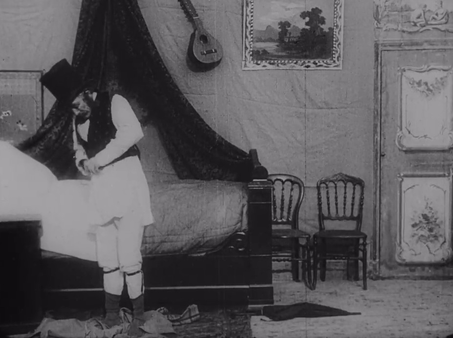 Sometimes all a fellow wants to do is get ready for bed in peace, but this unfortunate soul finds himself tormented by early cinema tricks. Each time he tries to remove an item, it springs back on to his body. The actor's bald-pate, full whiskers and checked trousers suggest the exaggerated dress of a music-hall comedian, but the joke rests entirely on cinema trickery. When he throws away a garment, the camera is paused; then it is replaced and the camera begins filming again. Voila, movie magic!