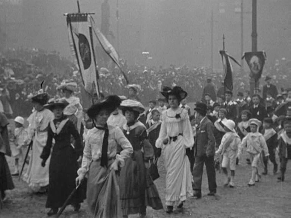 18,000 marchers, many of them children, joined this ambitious Whit procession - an annual show of pride for Manchester's Catholic population. The procession lasted over two hours, with highlights captured by Mitchell and Kenyon's camera from several vantage points. Many of the children were from poorer families, and their splendid outfits would have needed much scrimping.