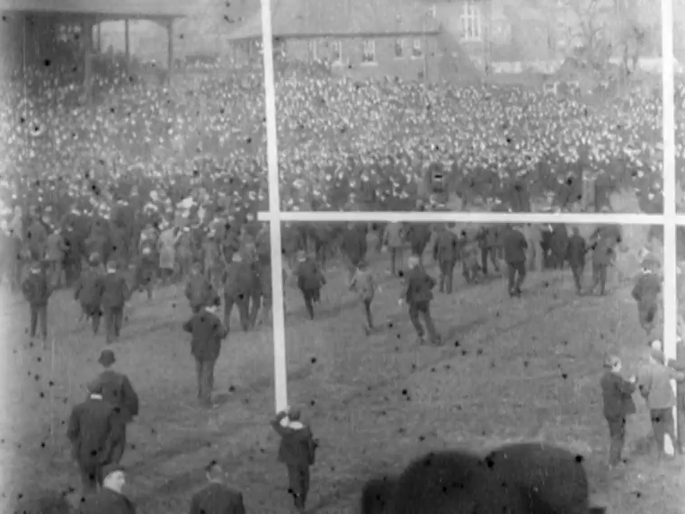 This is the last of the dozen rugby fixtures in the Mitchell & Kenyon collection, and the only cup final, a Yorkshire v Lancashire battle. Tries are rare in early film records of rugby matches, but it's still frustrating that the cameraman fails to follow a Halifax player's kick over the Salford try line and so misses an early score, jubilantly celebrated by the men in stripes. Halifax won 7-0.