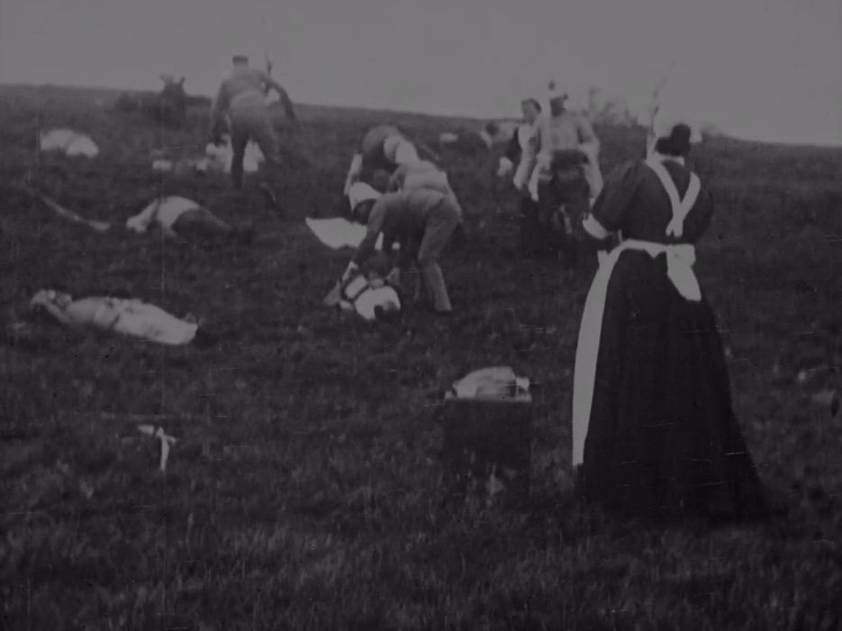 In scene one, Brits and Boers battle, then in scene two nurses arrive to tend to the wounded and the dead, strewn across the frame. But what may seem like incredible battle scenes are too good to be true. The composition and arrangement of figures on the landscape could hardly be bettered: the film is part of the widespread practice of constructing Boer War scenes for public consumption. However, we need to be careful about labelling this as 'fake news'. We mustn't assume that audiences were completely gullible about the artifice.
