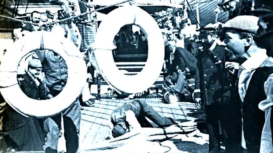For larks, these passengers on a Victorian ship have gathered on deck to run an obstacle race, clambering over and under bars then wriggling underneath a tarpaulin. It's the final hurdle that proves the toughest to overcome - hopping through a lifebelt. If you look closely, you'll see that one hapless chap gives up altogether. Watching the race, you can see the captain of the ship and other officers, as well as more passengers, cheering on their friends.