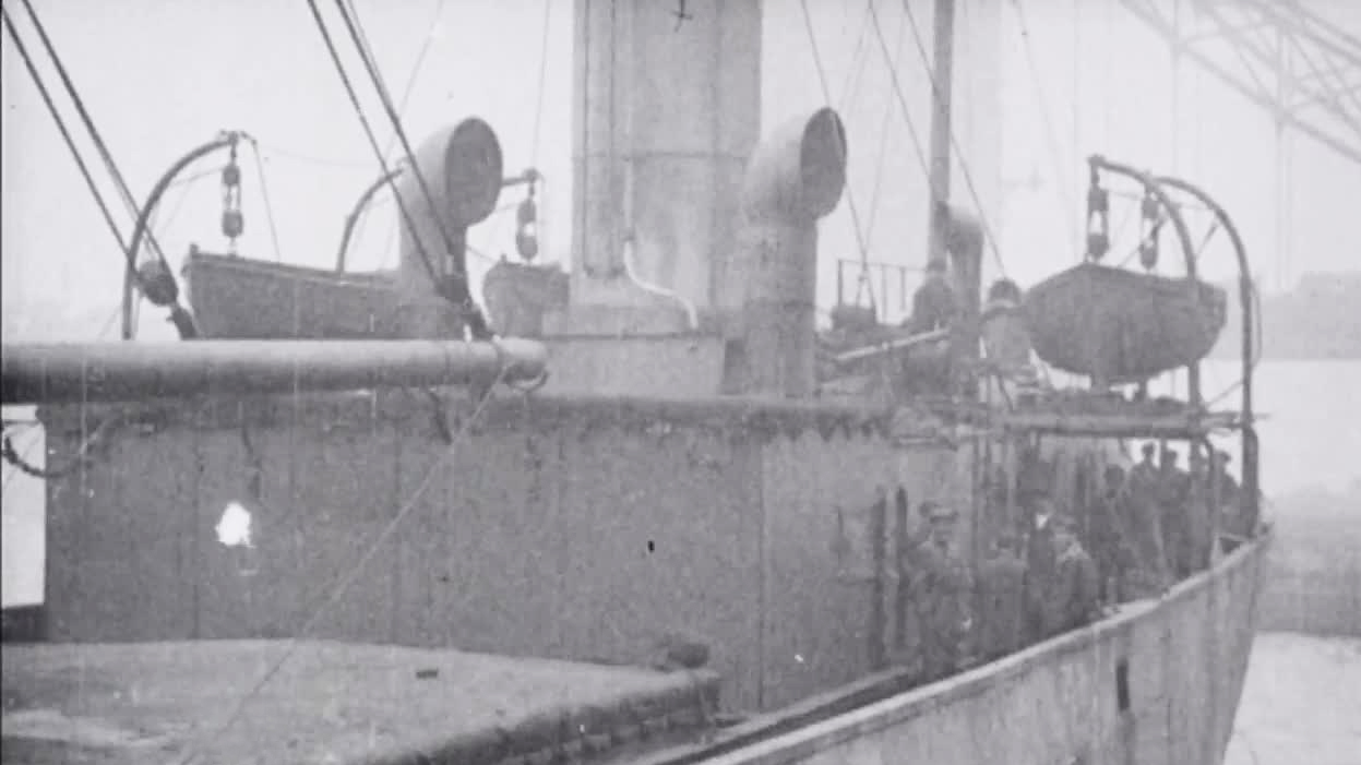 In August 1918 the Collier Suffolk Coast was requisitioned by the Admiralty & became HMS Suffolk Coast; being used as a Q-ship & collier for the rest of the First World War. Developed as a decoy, a Q-ship was a civilian ship disguised as a tramp steamer or other lone vessel, but actually heavily armed to lure U-boats within firing range. After the war she was moored at St Katherine's Dock in London and open to the public during late 1918 & early 1919. She returned to her peacetime duties as a cargo vessel in July 1919. As the ship is moored, crew laugh and joke on deck as Lieutenant Harold Auten V.C, Commander of the Q-Boat Suffolk Coast, can be seen disguised as skipper of a collier as he surveys his ship.