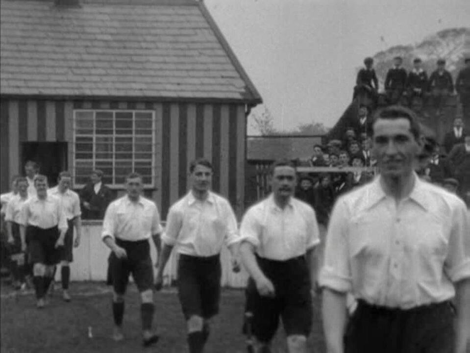 As the players emerge onto the pitch it's possible to make out a tattered notice pinned to the wall of the changing rooms proclaiming 'No Betting'. Gambling on football matches emerged almost as soon as the game, but it was a mostly furtive practice before the arrival of the football pools in the 1920s. The positioning of the notice makes you wonder if it was aimed at the crowds or the players.