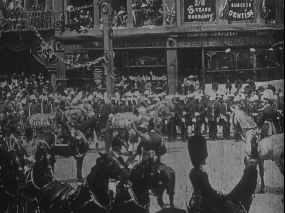 Queen Victoria can just be made out under her umbrella in this sequence filmed in St Paul’s Churchyard during her Diamond Jubilee.