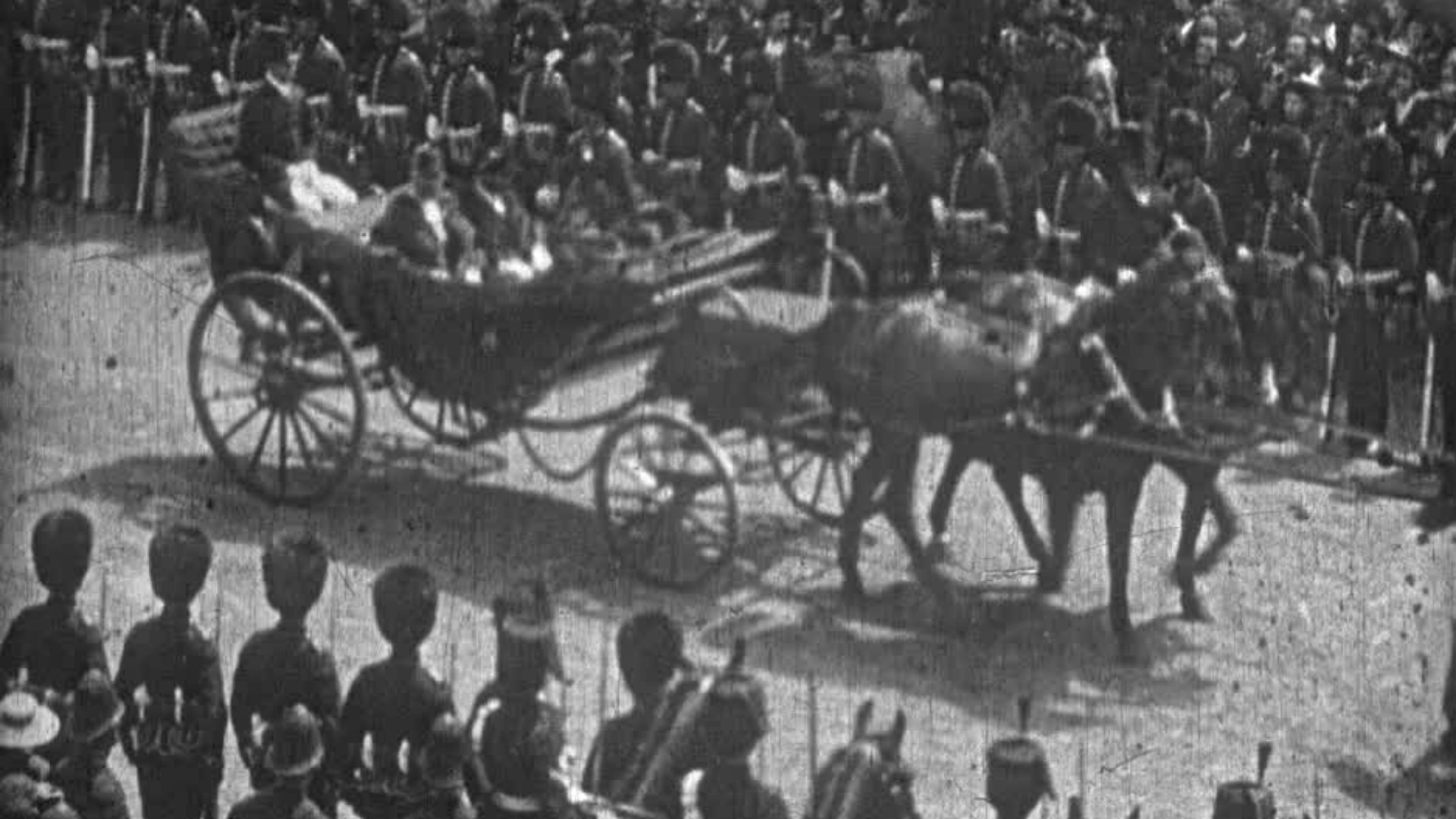 This film was taken by one of Robert Paul's cameramen towards the end of the parade, as the procession was returning across the river via Westminster Bridge. It shows some of the extended Royal Family file past in multiple carriages - no wonder the film was sold under the Code Word "CAVALCADE."