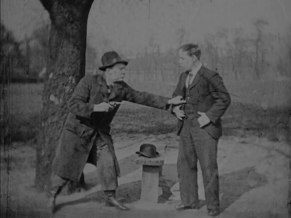 An audacious daylight robbery is played for laughs in this short Victorian skit, poking fun at a certain kind of prudishness and ideas of respectability. At gunpoint, a gentleman hands over his wallet without too much fuss, but when the bandit demands his trousers too, see how he quakes in fear and begs for mercy. Losing cash is one thing, but losing face is clearly much more serious indeed - and the hapless victim waddles off with only his shirt tails to protect his modesty.