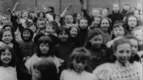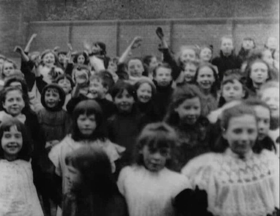 Some of Mitchell and Kenyon's 'school gate' films were more disciplined, but with these very young children the effect is much livelier, with the boys directly playing up to the camera and the girls being giggly and coquettish (aside from one at the back caught doing up her shoe). A second shot shows the over-excited children being marshalled by their teachers, but the chaotic impression remains.