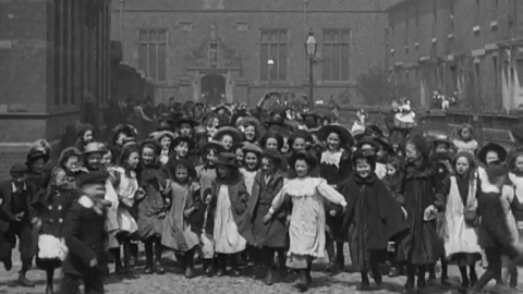 While the younger children in this lively film are vigilantly corralled by their schoolmistresses, the older boys get special dispensation to react freely to Mitchell & Kenyon's cameras. As so often in these films, the action is partly staged. The schoolchildren's neat and healthy appearance is in contrast to the often visible poverty of the workers in many of the filmmakers' factory films.
