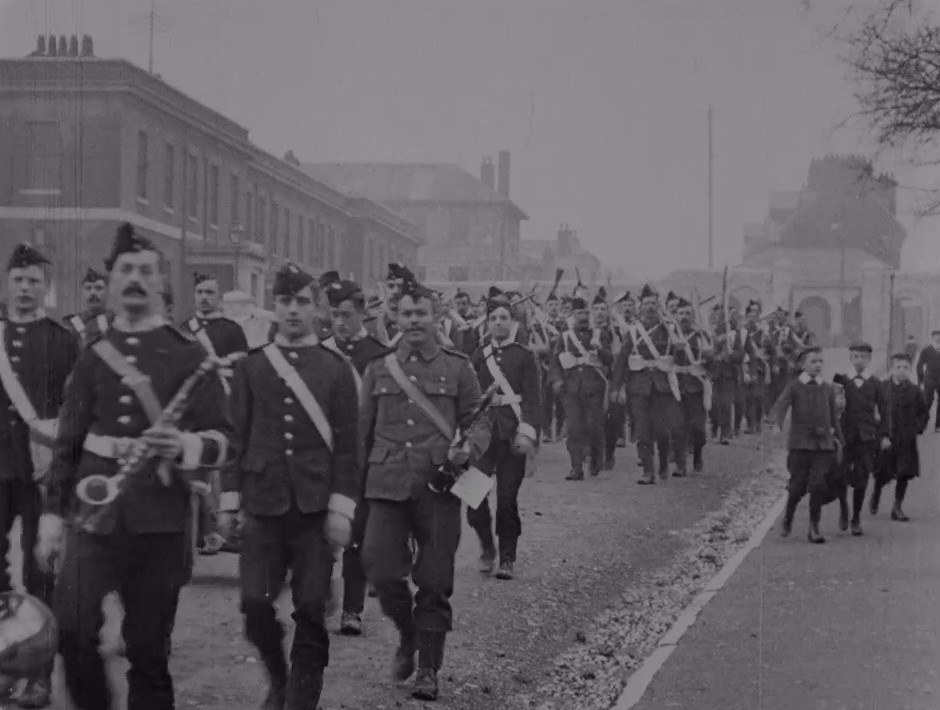 As marches go, this is a relatively casual one, and some smiling faces suggest life in the army isn't all bad. Look out, in particular, for the young lad at the rear of the marching band. Barely older than the boys stalking alongside, he seems particularly proud, perhaps thinking of who might see him in his uniform thanks to the wonder of the cinematograph. The barracks building in the background suggest that this lot, unlike many other marching soldiers of the time, haven't yet been chosen to head to war in South Africa.