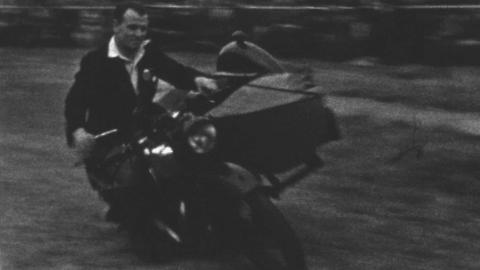 Gee whiz, this bike's got some fizz! Crowds watch as a motorcyclist with sidecar completes a number of laps in unconventional style around the track at Pengam Airfield, the chimneys of the East Moors Steelworks visible in the background. He survives the course – as does a nonchalant pedestrian crossing the track - and is applauded by a mechanic friend. See also ‘Sport, on two wheels' for other footage of motorcycle racing at the same location.