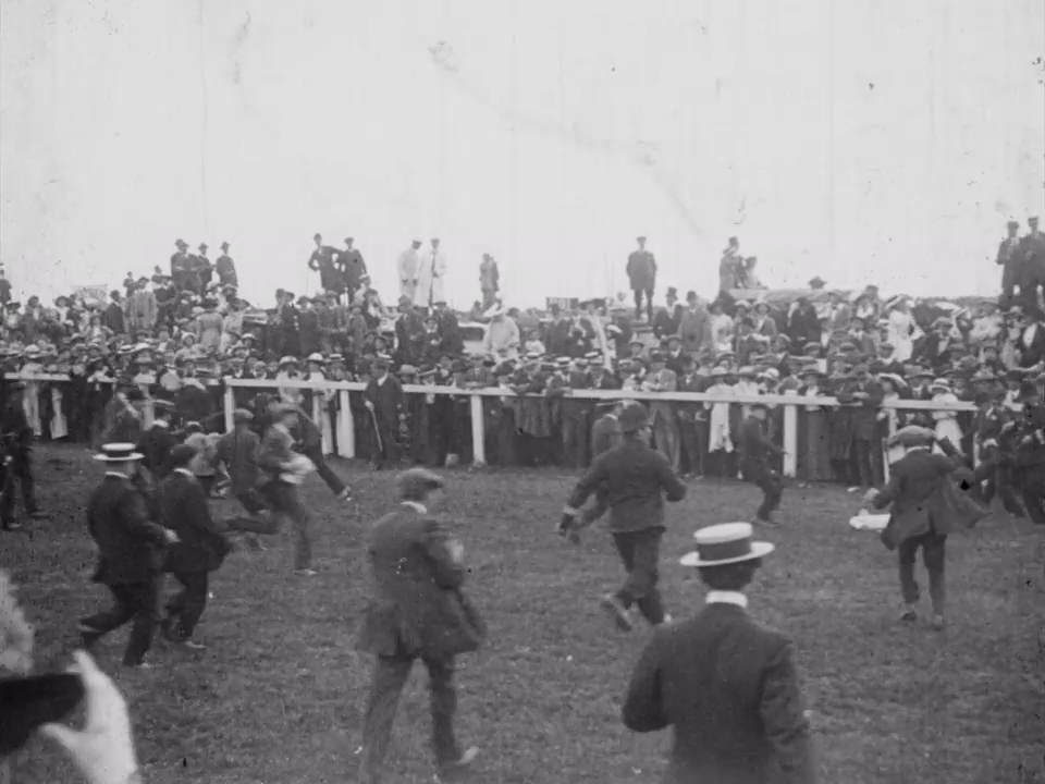This newsreel footage captures a milestone event in the campaign for women's suffrage: the trampling to death of activist Emily Davison under the hooves of the King's horse at the 1913 Epsom Derby. The film begins, much like any other of Derby day, with scenes before the off - bobbies having their luncheon and cars arriving at the scene, including the carriage of King George V, mobbed with onlookers. As the race gets underway and the riders round Tattenham Corner, the camera is trained firmly on the track. Emily steps out.