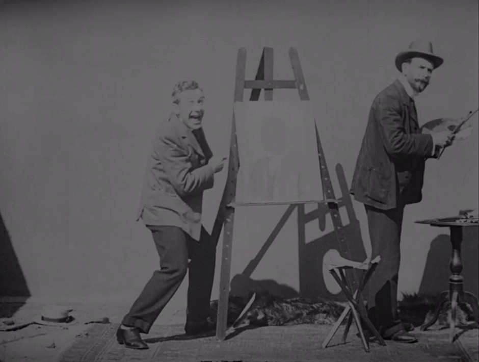 This artist's model may never work again after his ill-advised prank. While the artist isn't looking, his model cuts a hole in the painting and puts his face through it - and is decorated with a painted beard for his trouble. The battering the prankster gets is probably no less than he deserves for literally defacing a work of art...