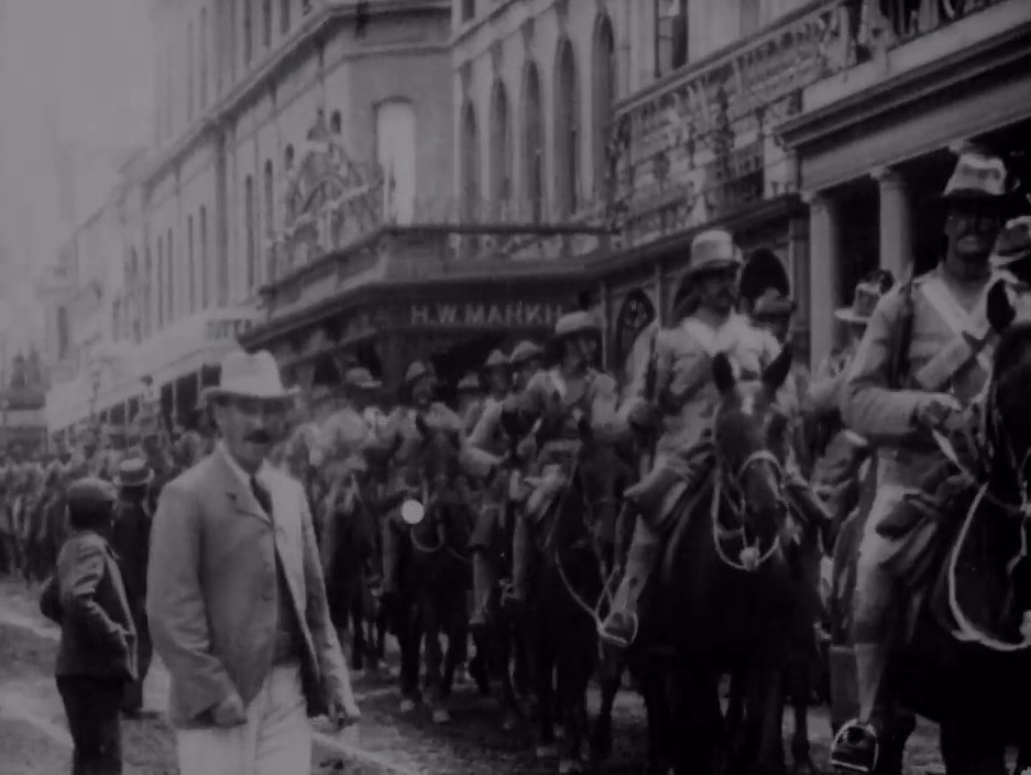 Australia offered 16,000 men to the Empire’s war effort in South Africa. Here a portion of them can be seen marching through Cape Town in late December 1899, on their way to the front. Of particular interest is the presence of Edgar Hyman (a South African entertainment entrepreneur) in a white suit. He seems to be directing the camera and soliciting waves from the mounted rifles, ever the showman no matter the context.