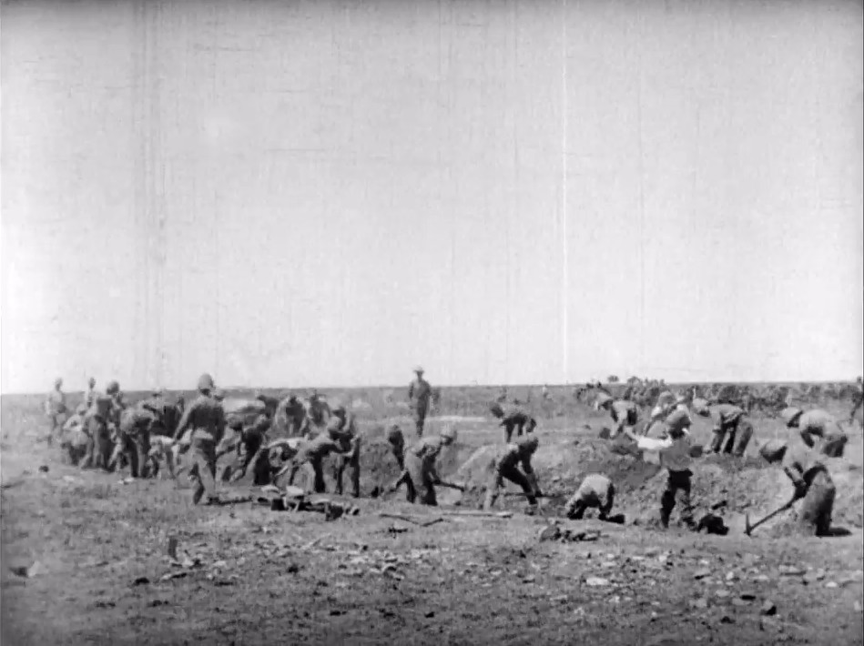 In a desolate landscape British troops from the Fifth Northumberland Fusiliers dig in during the Boer War. We know with some precision that this film was taken on the 12th November 1899 by John Benett-Stanford. The Warwick Trading Company catalogue advertising the film pointed out that some of these troops may have been among the 600 missing after the Battle of Stormberg Reverse. The armoured train is said to be heading off to support Colonel Gough's Column at the Battle of Belmont at Kaffir Kop.