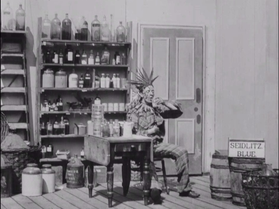 An inventive use of slow-motion filming helps hammer home the gag as an unconvincing 'Indian chief' hopes to dissolve some trapped wind with a popular brand of indigestion powder. Mixed incorrectly, this medicine was notorious for producing painful or dangerous side-effects - but in this film they are merely hilarious. The chief's stomach swells, allowing him to bounce around like a balloon before sadly bursting - with a jump cut and a puff of smoke.