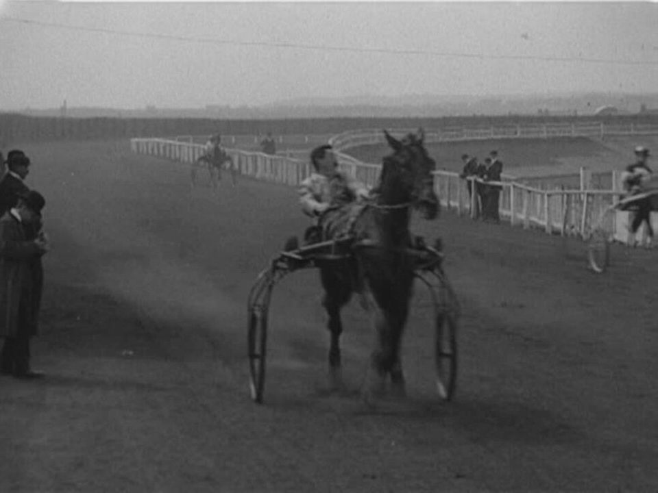 Attending trotting matches - in which horses in harness race at specific gaits - was a popular Edwardian pastime. We see the highlight of the day: a race in which the favourite, Wig Wag, is pipped to the post by General White thanks to the superior handling skills of his driver, George Wiltshire. For the benefit of the audience a showman holds up a 'winner' sign next to the victorious steed.