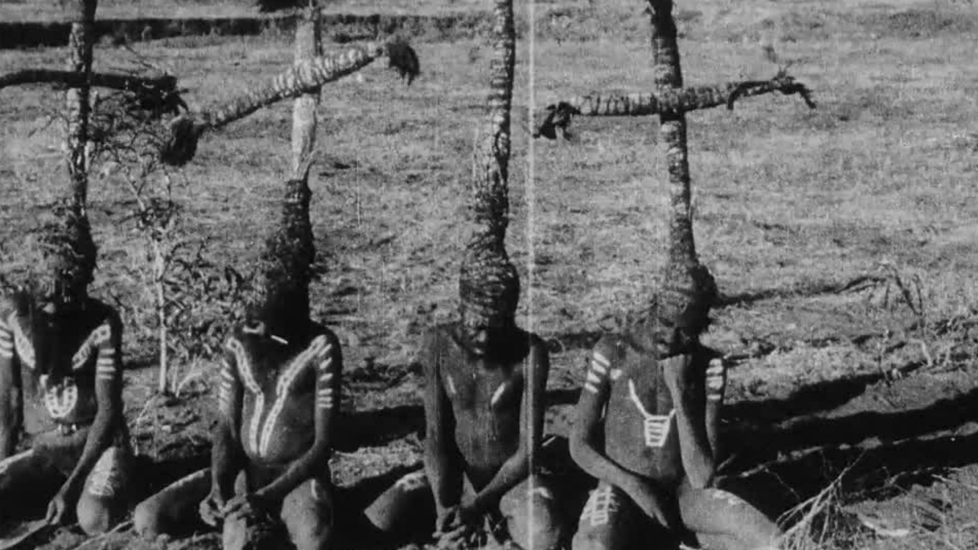 Short film showing members of the ‘pinto’ aboriginal tribe in Central Australia. Scenes include a pinto warrior making fire by friction between a wooden shield and a woomera (portable receptacle). Craftsman of the pinto tribe making a woomera with a chisel of chipped stone. A pinto warrior hurling a spear by means of the woomera. Pinto warriors in cross-shaped head-dresses made of grass and feathers bound with human hair - festive garb for a corroboree (dance ceremony).