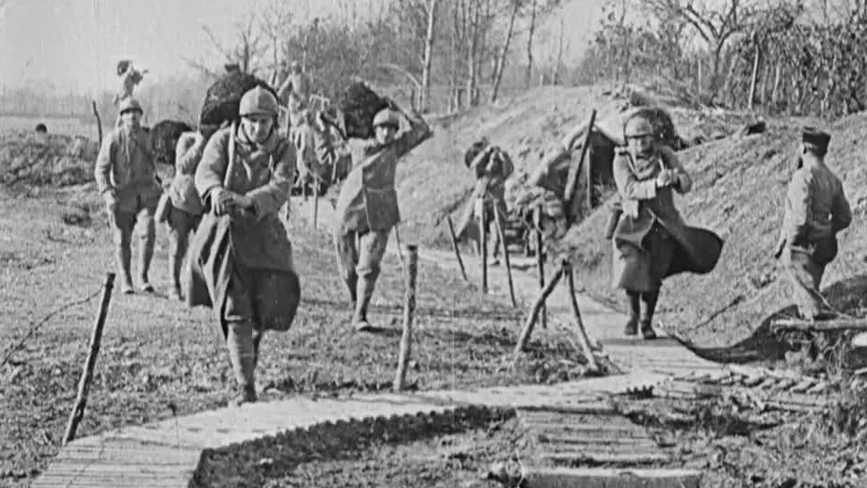 Bouquets of barbed wire: this brisk dispatch from the Champagne Front observes French soldiers manning a wire-ridden landscape. The item was filmed by the Topical Film company, whose newsreel at this point was directly controlled by the UK government’s war office.