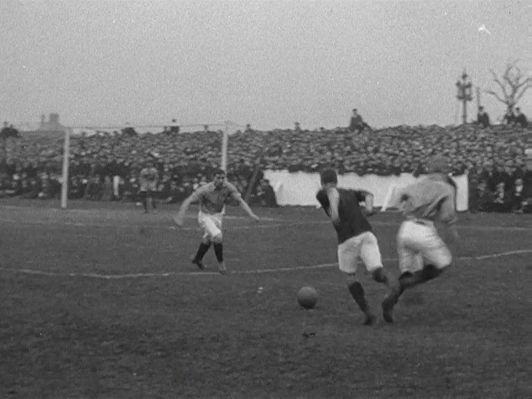 In what may be the earliest International football match recorded on film, Wales play Ireland in a Home Championship fixture at Wrexham's Racecourse Ground. Wales (in the darker kit) are cheered on by a lively home crowd. Two cameras cover the action, with edited shots showing the build up to two of the Welsh goals and drama in the penalty area. This was a high-scoring game, ending in a 4-4 draw.