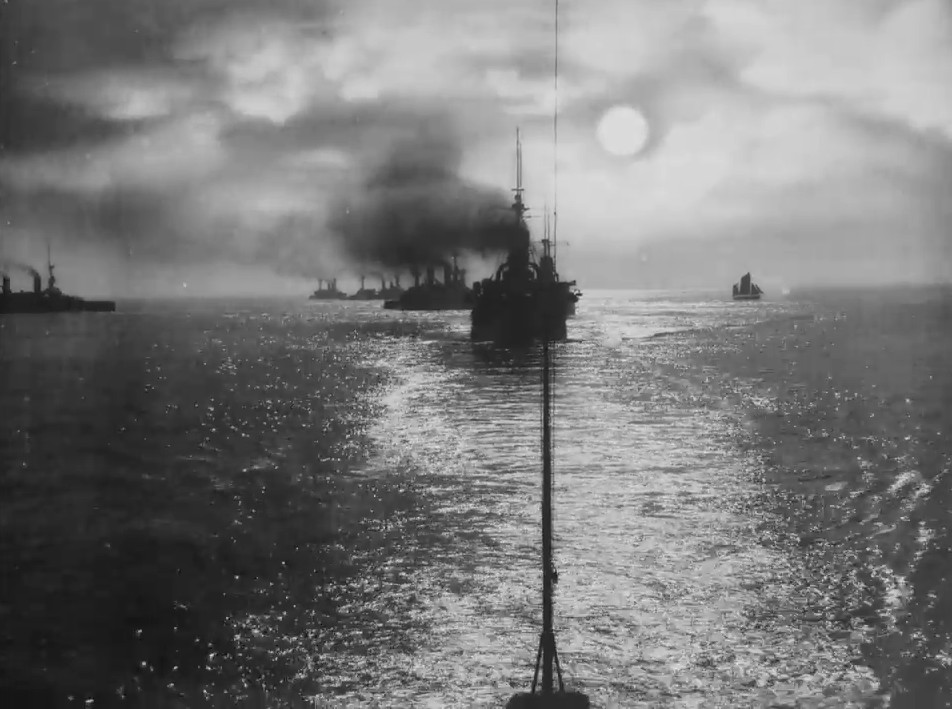 There's no doubting the beauty of this single-shot film showing a fleet of warships in the open sea. But something doesn't feel quite right. The natural bobbing of the lead ship means the horizon won't stay still, so why isn't the sky moving too? The answer is that it has been superimposed from another sequence, presumably because the original lacked the drama the filmmaker was after. For all its slightly queasy effect, the trickery is pretty impressive, until the sun suddenly appears *in front of* the mast of the following ship.