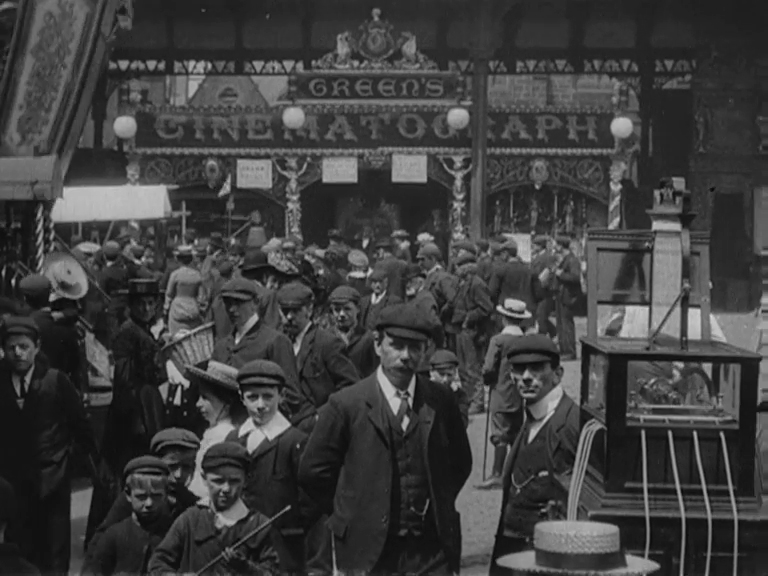This most evocative of Mitchell & Kenyon's fairground films shows an array of wonderful rides - the Racing Bantams carousel, boat swings, switchback gondolas - and the delighted faces of the holiday crowd. Better still, it shows the fantastic frontage of Green's Cinematograph show where this very film would have been shown. The intriguing machine in the foreground is a coin-operated phonograph.